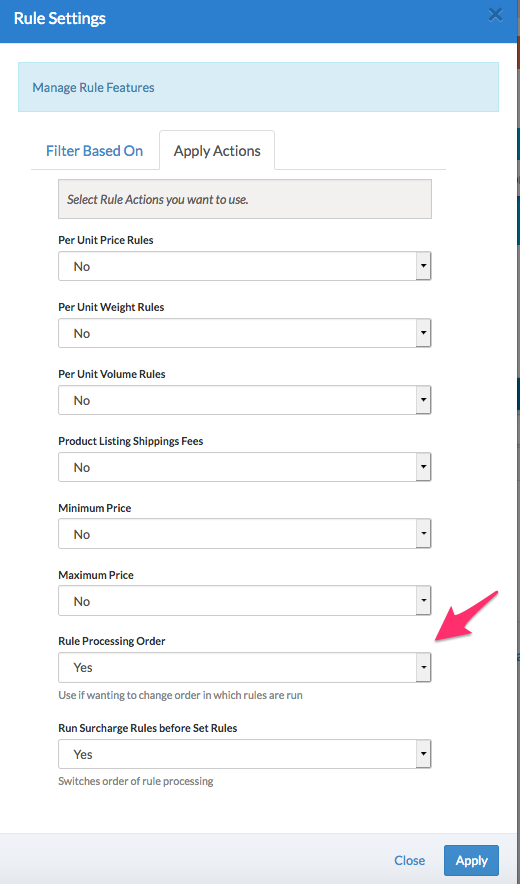 - Begin by activating 'Rule Processing Order'. This option is on the Shipping Rules page under "Shipping Rule Settings". Click the "Apply Actions" tab, switch Rule Processing Order to 'Yes', and hit Apply.