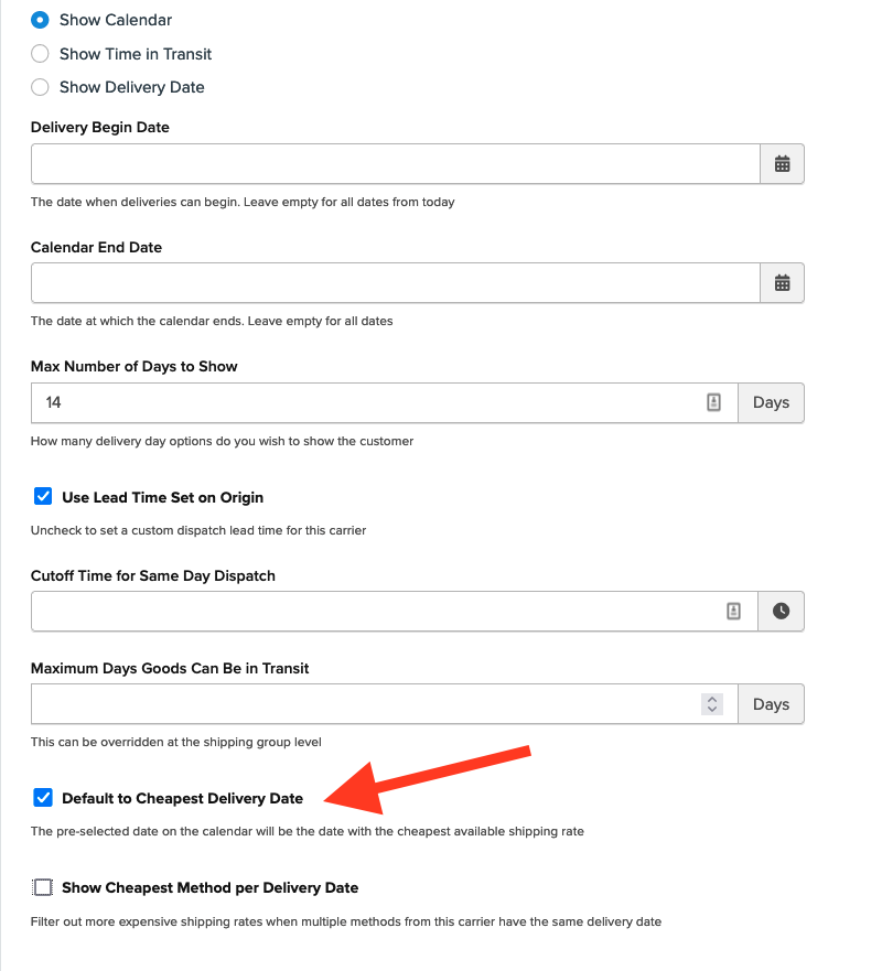 - Scroll to and enable Default to Cheapest Delivery Date.