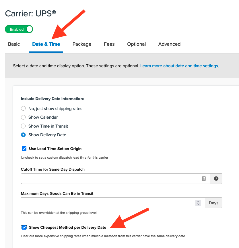 - Choose the carrier(s) for which you want to apply this feature (e.g., UPS). Navigate to the Delivery Date & Time tab and select Show Cheapest Date while keeping Show Delivery Date active.