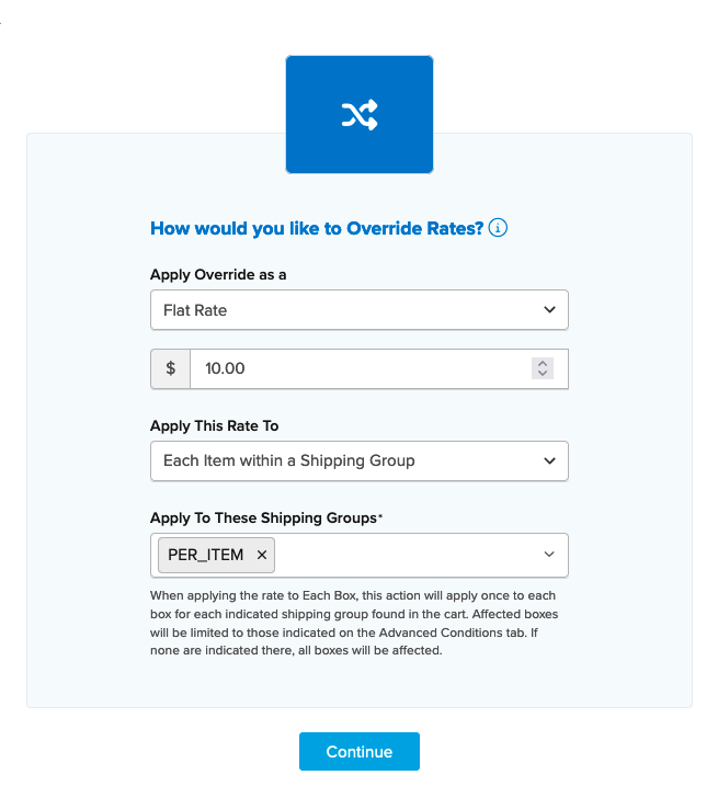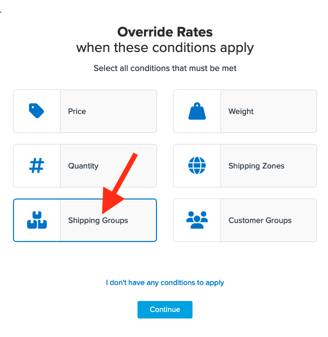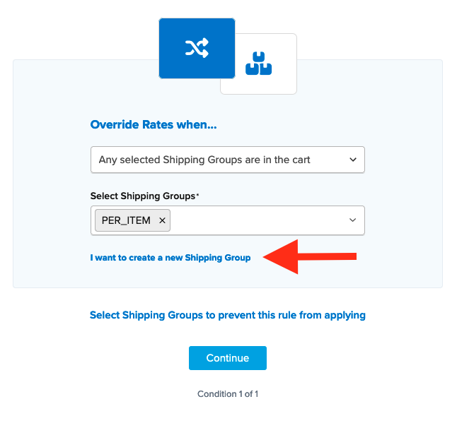 - Select Shipping Groups for the condition to be used in this rule and click Continue once more to proceed.