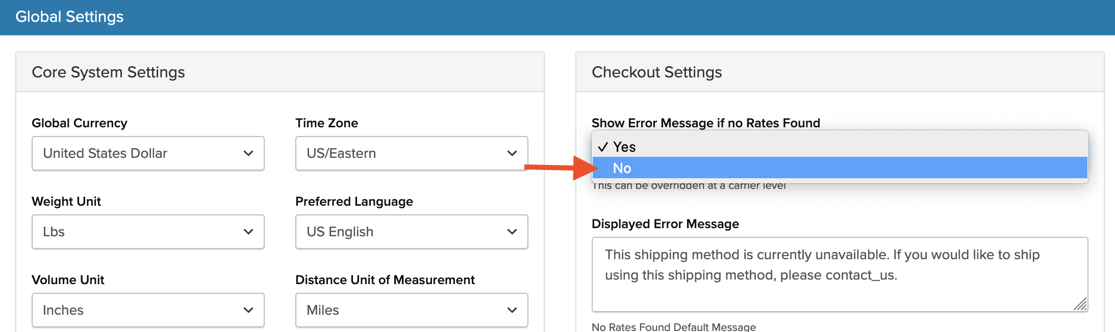 - Locate the field titled Checkout Settings and use the drop-down menu to set Show Error Messages if No Rates Found to No.