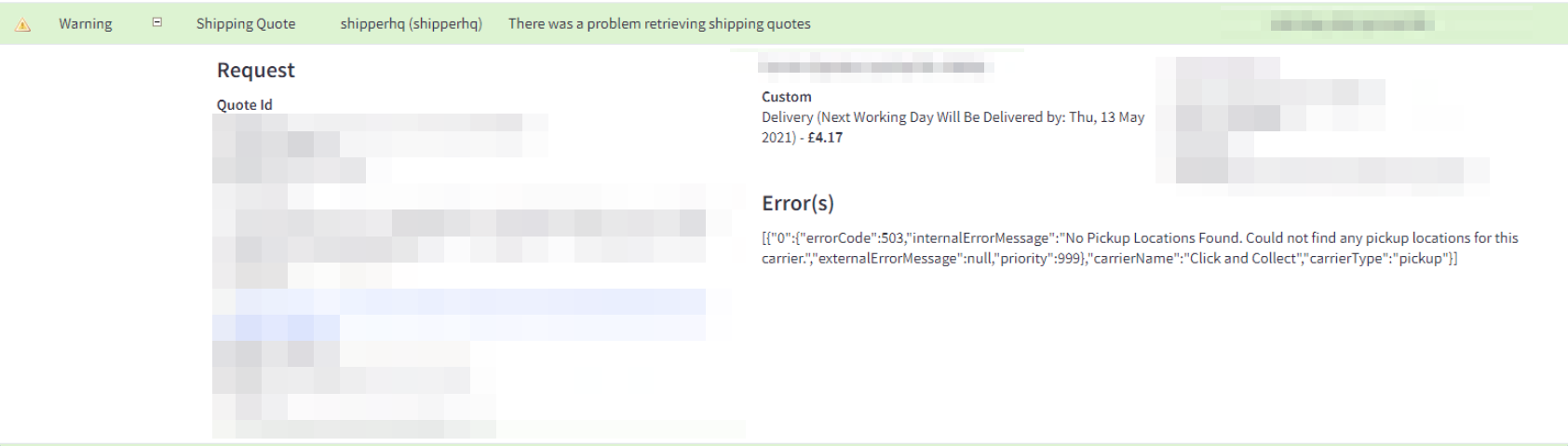 Note: You will still see an "Error" message in your BigCommerce logs for cases where ShipperHQ returned no rates at all, even if this was intentional (for example, preventing shipping of products assigned to a certain Shipping Group to a certain region).