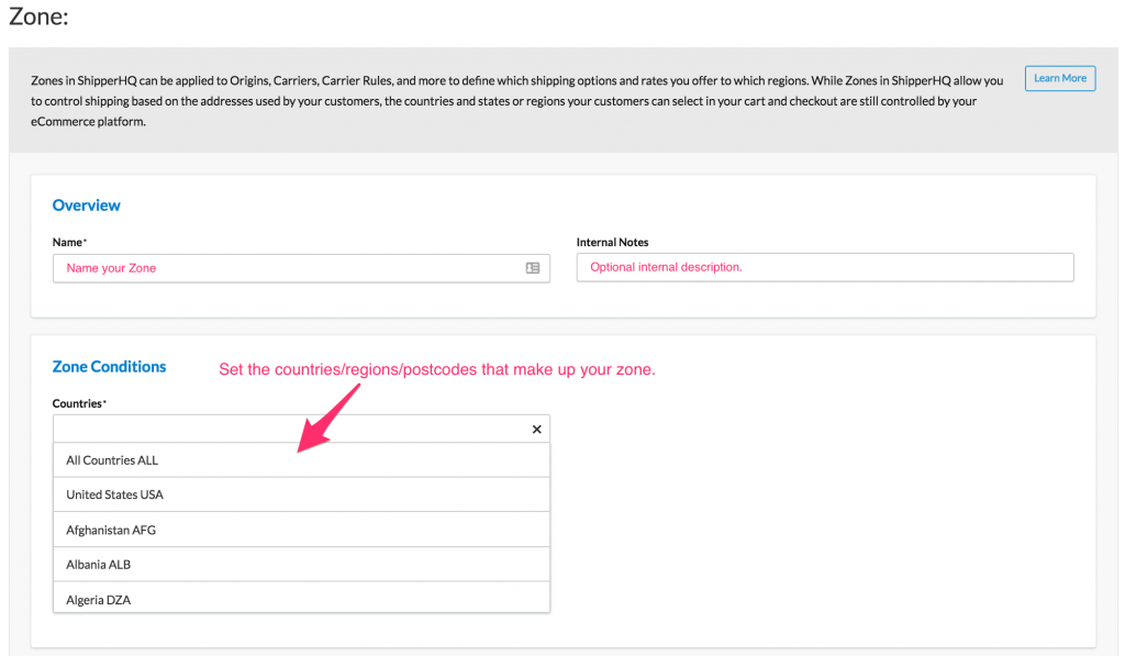 Use Shipping Zones to control shipping options and rates based on customer addresses. Remember, the addresses selectable in your cart are determined by your eCommerce platform.
